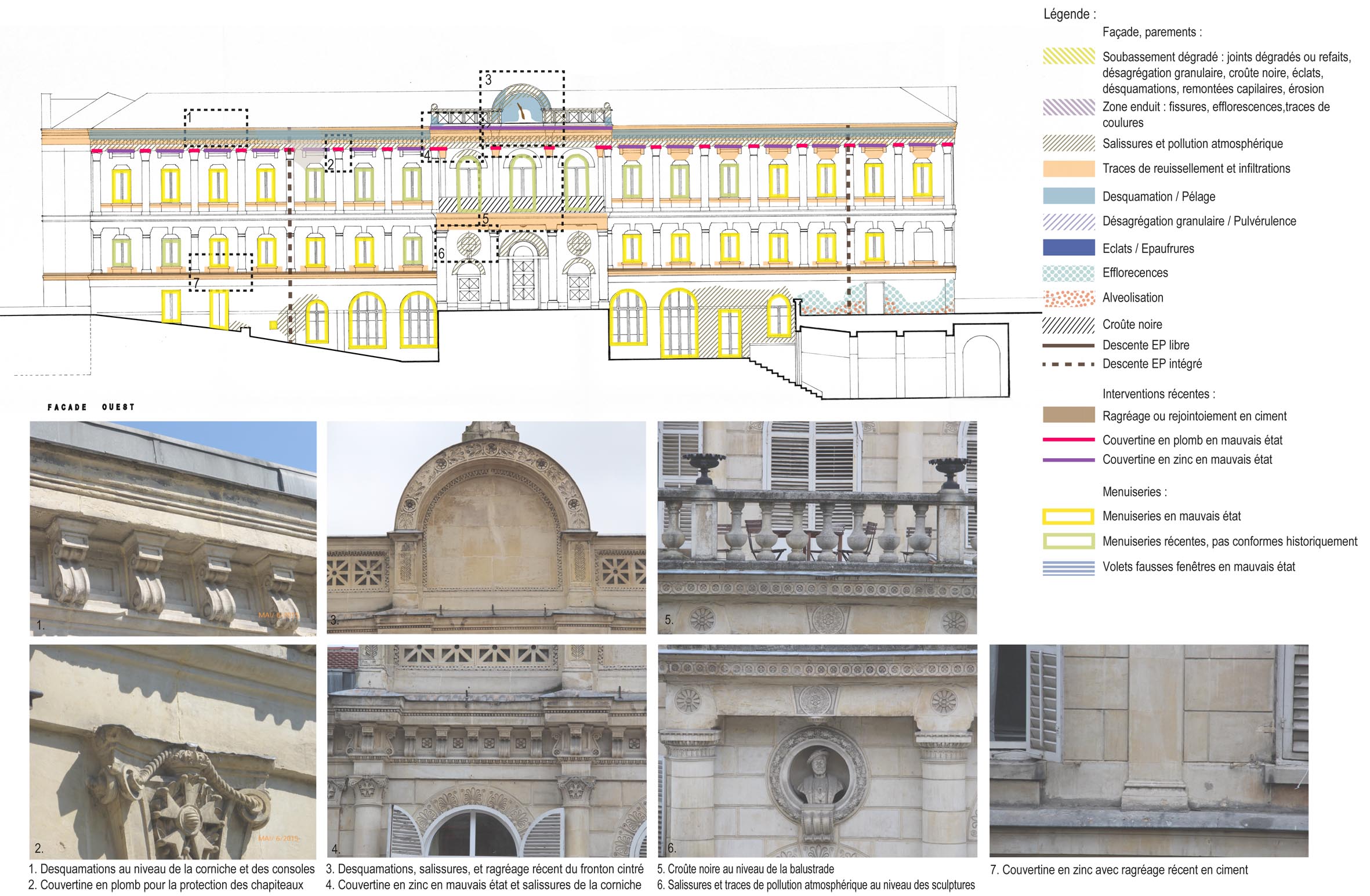 Les couvertures ont été rénovées en 1988 et les matériaux mis en oeuvre à cette époque présentent aujourd’hui des signes de fatigue. Les façades souffrent de pathologies qui ne menacent pas l’intégrité du bâtiment. Le constat d’état des menuiseries extérieures est plus alarmant : de nombreuses fenêtres n’assurent plus l’étanchéité et celles qui ont été remplacées pour répondre aux plaintes des utilisateurs ne respectent pas les modèles d’origine.